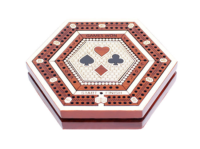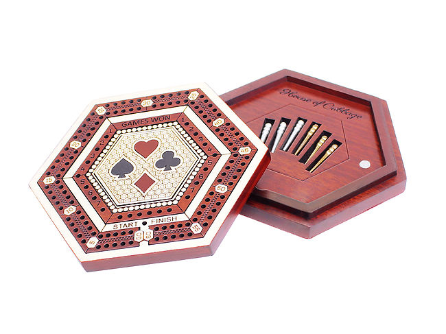 House of Cribbage presents a Hexagonal Shape 2 track (60 Points) Wooden Travel / Pocket Size non-continuous cribbage board made for up to 2 players. The board measures 4 inches x 3.75 inches (LxB) and can be used to play games between a pair of players.