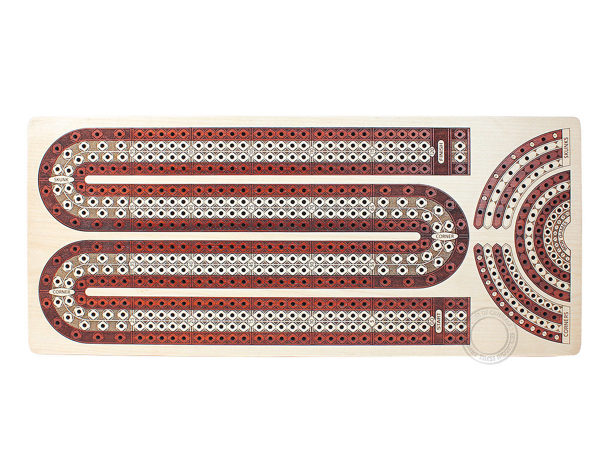 The handmade cribbage board has been inlaid in Blood Wood and Maple Wood. Outer two tracks are carved out of Blood Wood which is surrounded by Maple Wood. Whereas the inner two tracks are made of maple wood. The numbers on the tracks are also engraved and not painted. We don't use any screen prints or paints to create numbers or tracks on cribbage board.