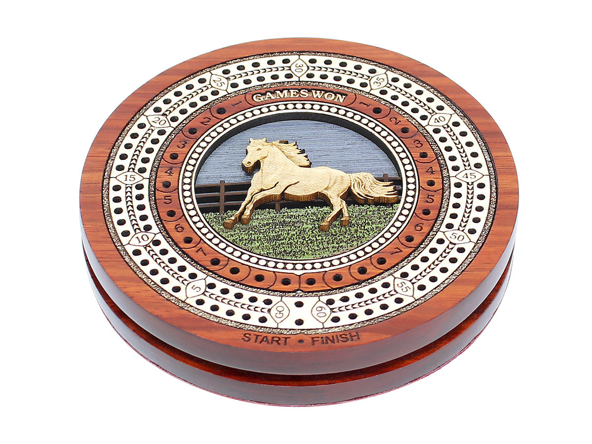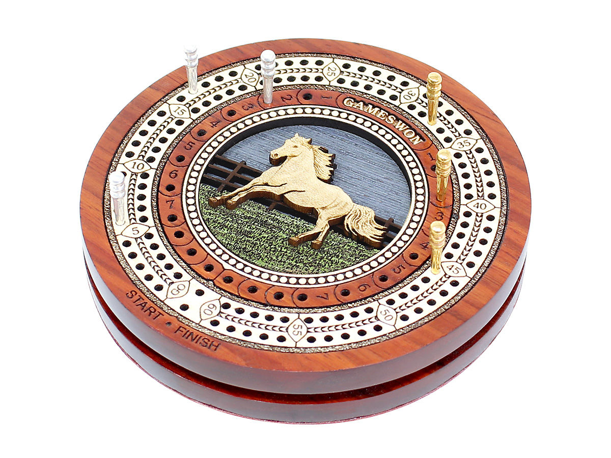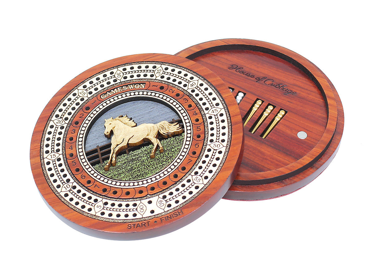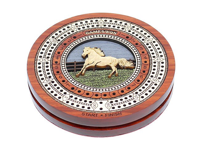 The Wooden Carved Running Horse picture has been inlaid in the center of the board. The cribbage board can be split into two separate parts. The upper part is a cribbage board and the lower part is a storage area for the pegs.