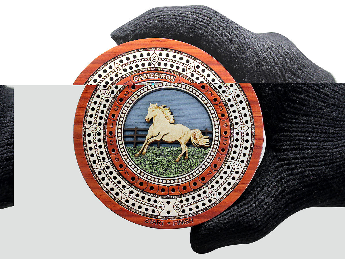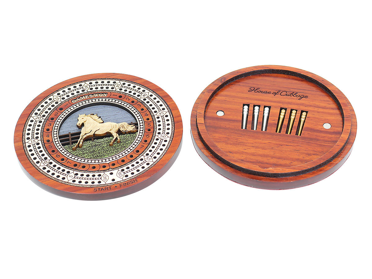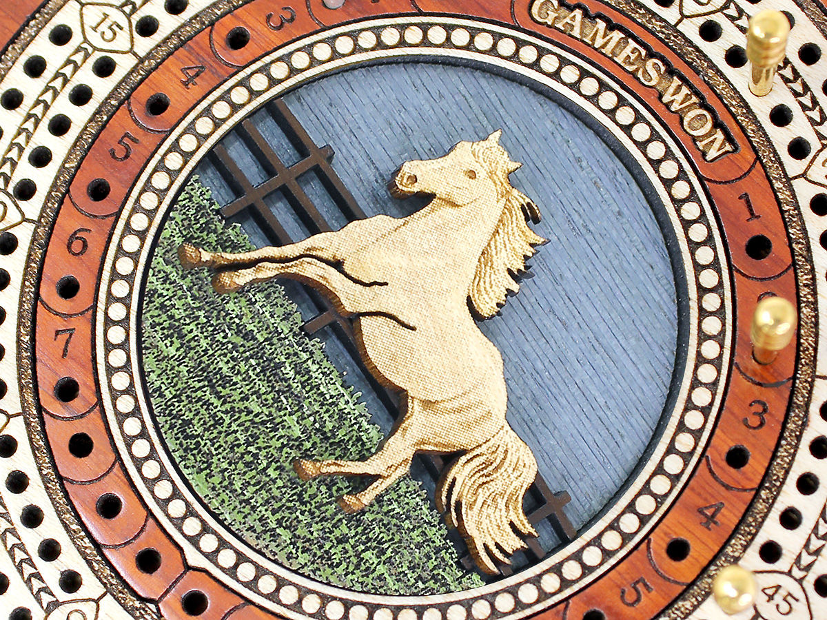The Wooden Carved Running Horse picture has been inlaid in the center of the board. The cribbage board can be split into two separate parts. The upper part is a cribbage board and the lower part is a storage area for the pegs.