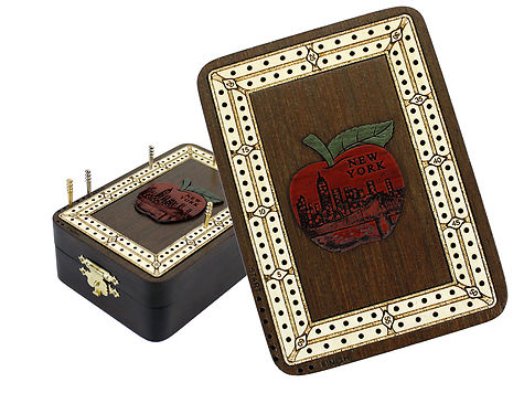 Apple New York Wood Carved Inlaid Folding Cribbage Board / Box Wenge Wood / Maple - 2 Tracks